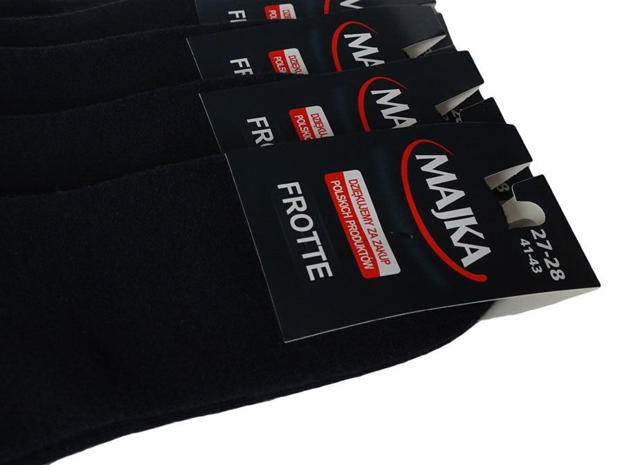 Skarpety frotte produkowane są z wysokogatunkowej 100% bawełny czesanej. Dodatkowo wzmocnione w pięcie oraz palcach. Są bardzo ciepłe, wygodne, a zarazem trwałe. Idealnie nadają się na chłodniejsze dni. Świetnie dopasowują się do stopy. W swoim składzie posiadają włókno, które doskonale odprowadza pot, nie powoduje alergii i grzybic. Ważną zaletą jest również fakt, że palce łączone są bezszwowo co zdecydowanie zwiększa komfort użytkowania.
